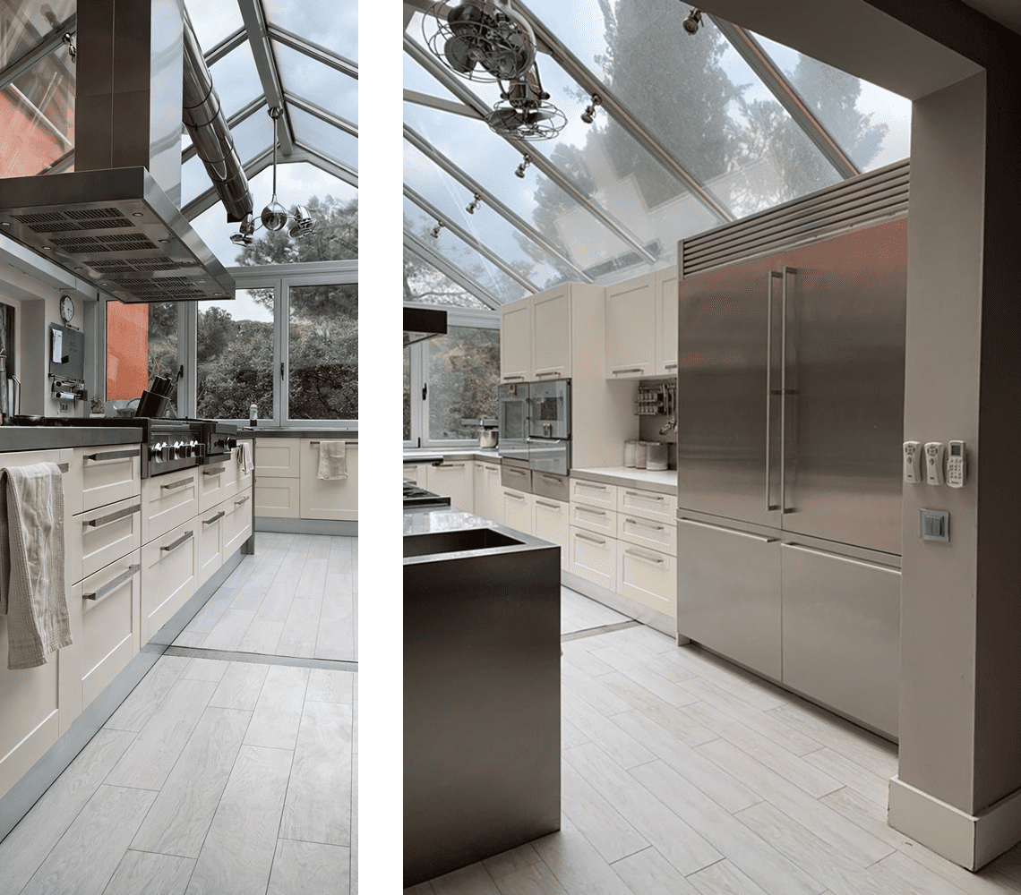 Integrar una cocina moderna en una extensión completamente acristalada rodeada de bosque. El reto: instalar todos los elementos funcionales sin comprometer la transparencia del espacio ni la estructura de vidrio.